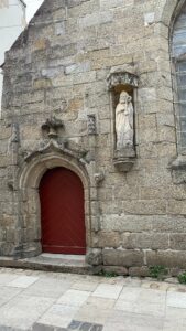 On y remarque un bel encadrement de porte à pilastres et fleuron. Au haut du pignon, se trouvent les vestiges de blasons des seigneurs fondateurs. Dans une niche à dais, la statue de Saint Guénolé (1954).